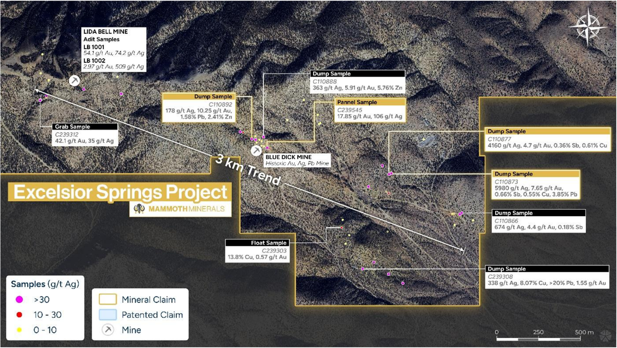 Figure 1: Sampling highlights from latest sampling campaign conducted by Mammoth across the Blue Dick Trend, Excelsior Springs (source: Mammoth Minerals Limited).