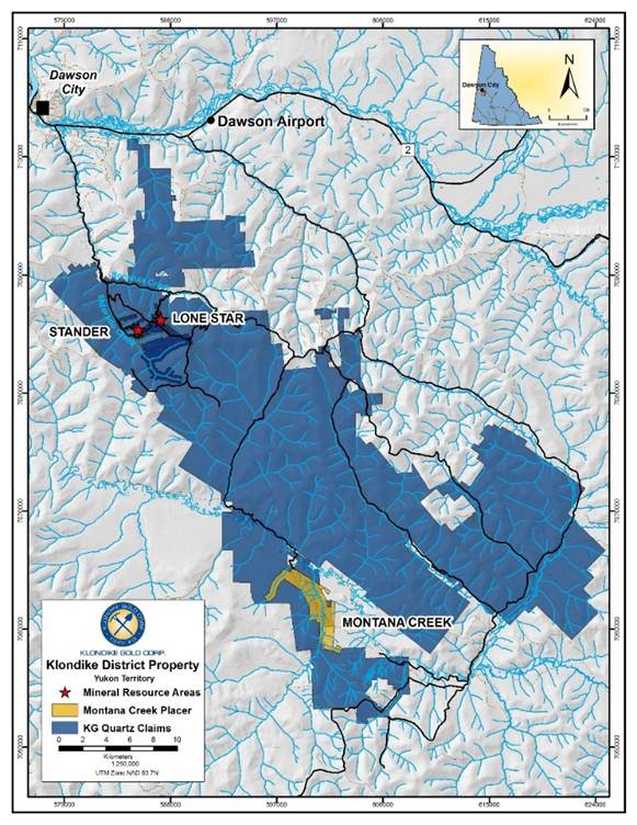 Klondike Gold is a Vancouver based gold exploration company advancing its 100%-owned Klondike District Gold Project located at Dawson City, Yukon, one of the top mining jurisdictions in the world. The Klondike District Gold Project targets bedrock gold associated with district scale orogenic faults along the 55-kilometer length of the famous Klondike Goldfields placer district. Multi-kilometer gold mineralization has been identified at both the Lone Star Zone and Stander Zone, among other targets. The Company has identified a pit constrained Mineral Resource Estimate of 469,000 Indicated and 112,000 Inferred gold ounces[1], a milestone first for the Klondike District. The Company currently maintains a royalty interest providing potentially significant seasonal cash revenue from the leased Montana Creek Placer Property. The Company is focused on exploration and development of its 729 square kilometer property accessible by scheduled airline and government-maintained roads located on the outskirts of Dawson City, Yukon, within the Tr’ondëk Hwëch’in First Nation traditional territory.