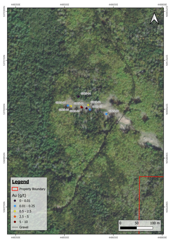 Surface bedrock sample results include: 7.36 g/t Au and 31 g/t Ag in GR25-05; 2.93 g/t Au and 14.3 g/t Ag in GR25-01; 0.783 g/t Au and 4.7 g/t Ag in GR25-02