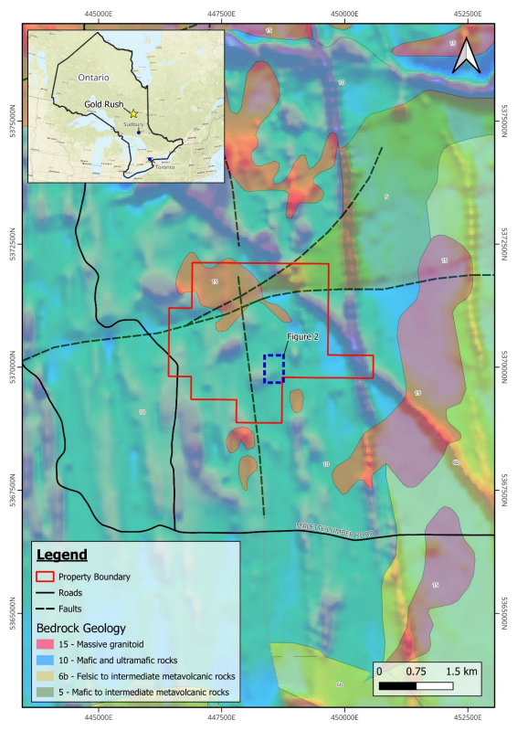 The Gold Rush Property is located in Turnbull township approximately 25 km west of the city of Timmins, Ontario and is accessible by all-season gravel road. It consists of 41 contiguous single cell mining claims covering an area of ~877 hectares. Loyalist has an option to earn a 100% interest in Gold Rush (see press release March 31, 2025.