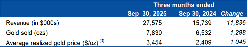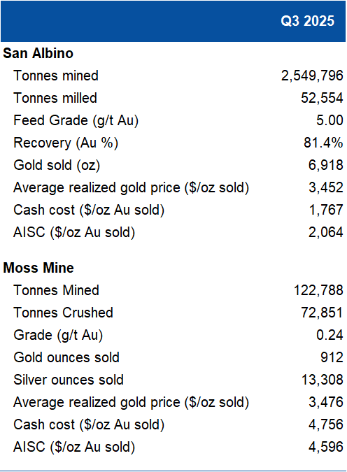 The Company’s financial results for Q3 2025 reflect revenues of $27.6 million (vs. $15.7 million in Q3 2024) from the San Albino and Moss mines, which generated $8.9 million in Mine Operating Cash Flow (1) (4), $9.3 million in Adjusted EBITDA(1), and $1.2 million in Net Income. The Company sold 7,830 oz of gold at an average price of $3,454/oz (3) with Cash Cost of $2,115/oz, and All-In Sustaining Cost (“AISC“) of $2,561/oz (1) (2), which includes the initial ramp up of the Moss Mine.