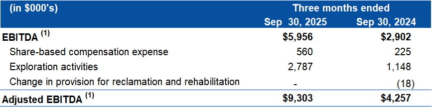 “Adjusted EBITDA” represents EBITDA, adjusted to exclude exploration activities, share-based compensation and change in provision for reclamation and rehabilitation.