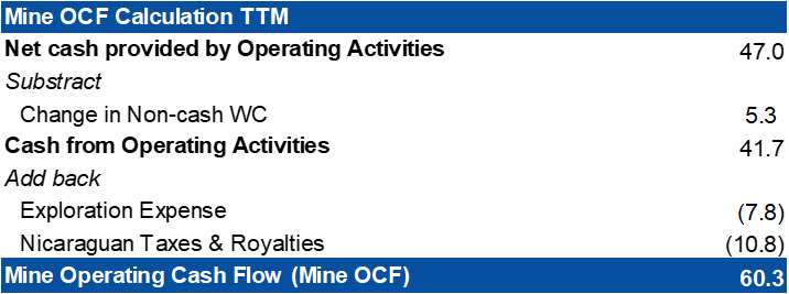 “Mine OCF” represents operating cash flow, excluding Nicaraguan taxes and royalties, changes in non-cash working capital and exploration expense
