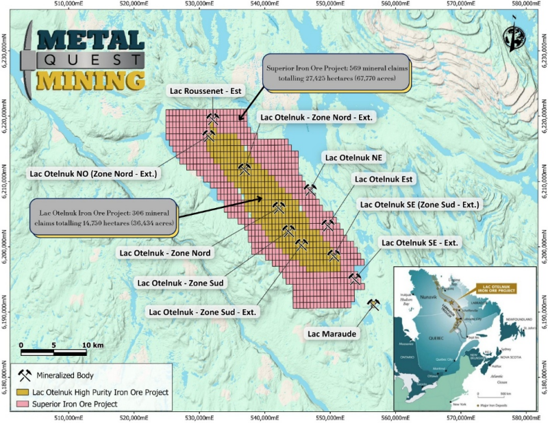 The Lac Otelnuk Iron Project, 100% owned by MetalQuest Mining, is one of North America’s largest historic NI 43-101 Iron project, located in the heart of the Labrador Trough — a globally recognized iron district. (https://metalquestmining.com/news/metalquest-mining-lac-otelnuk-iron-ore-project-overview/ )
