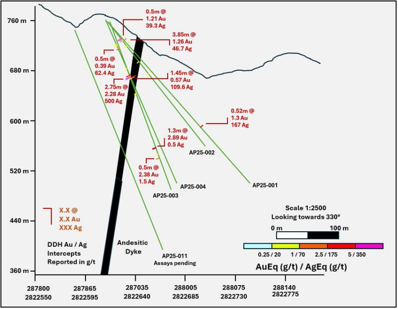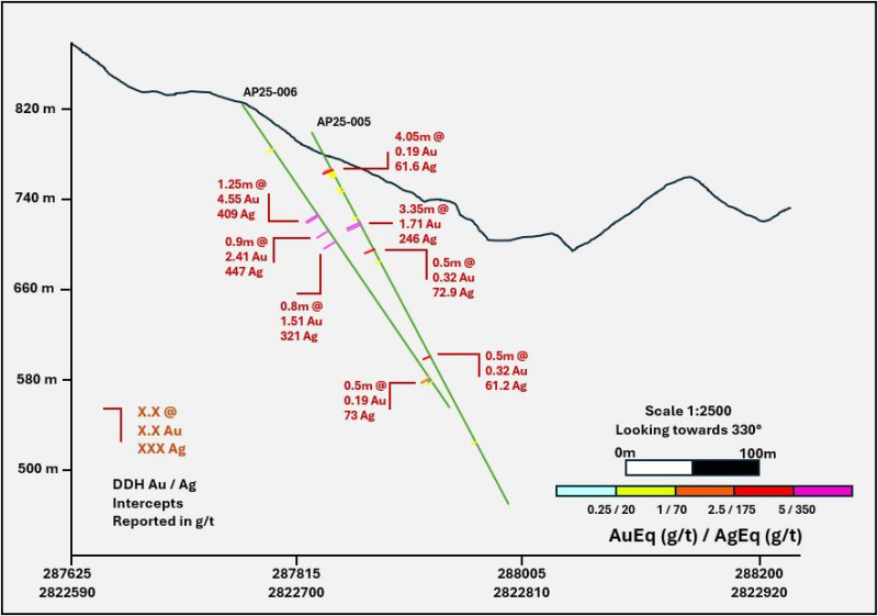2.75 m @ 660 g/t AgEq1 (2.28 g/t gold, 500 g/t silver) from 93.6 m (AP25-003), including
