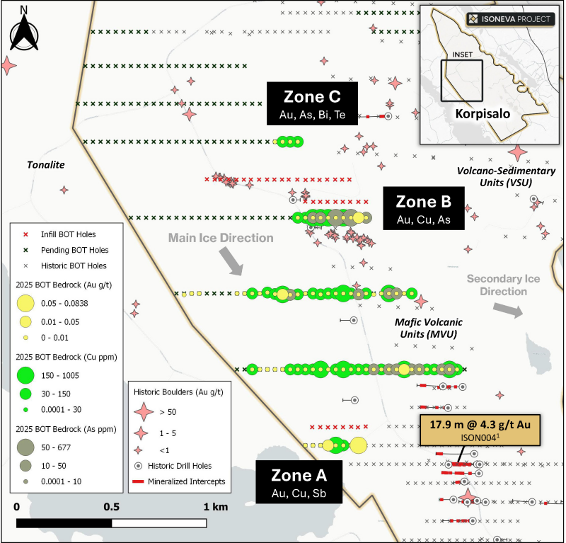 BOT drilling continues to return encouraging results from the Korpisalo grid, defining multiple gold and pathfinder element anomalies and refining the Company’s understanding of mineralization controls within the mafic volcanic sequence and adjacent intrusive contacts.