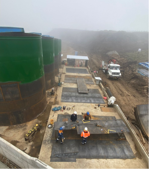 The civil works for the leaching area have been completed, and the installation of tanks, managed by JPC Ingenieros, has begun. All metal-mechanical materials are 100% purchased and delivered to site. Welding and assembly of the first four tanks are being finalized, while the bases for the remaining four tanks are underway, with completion expected by mid-December.