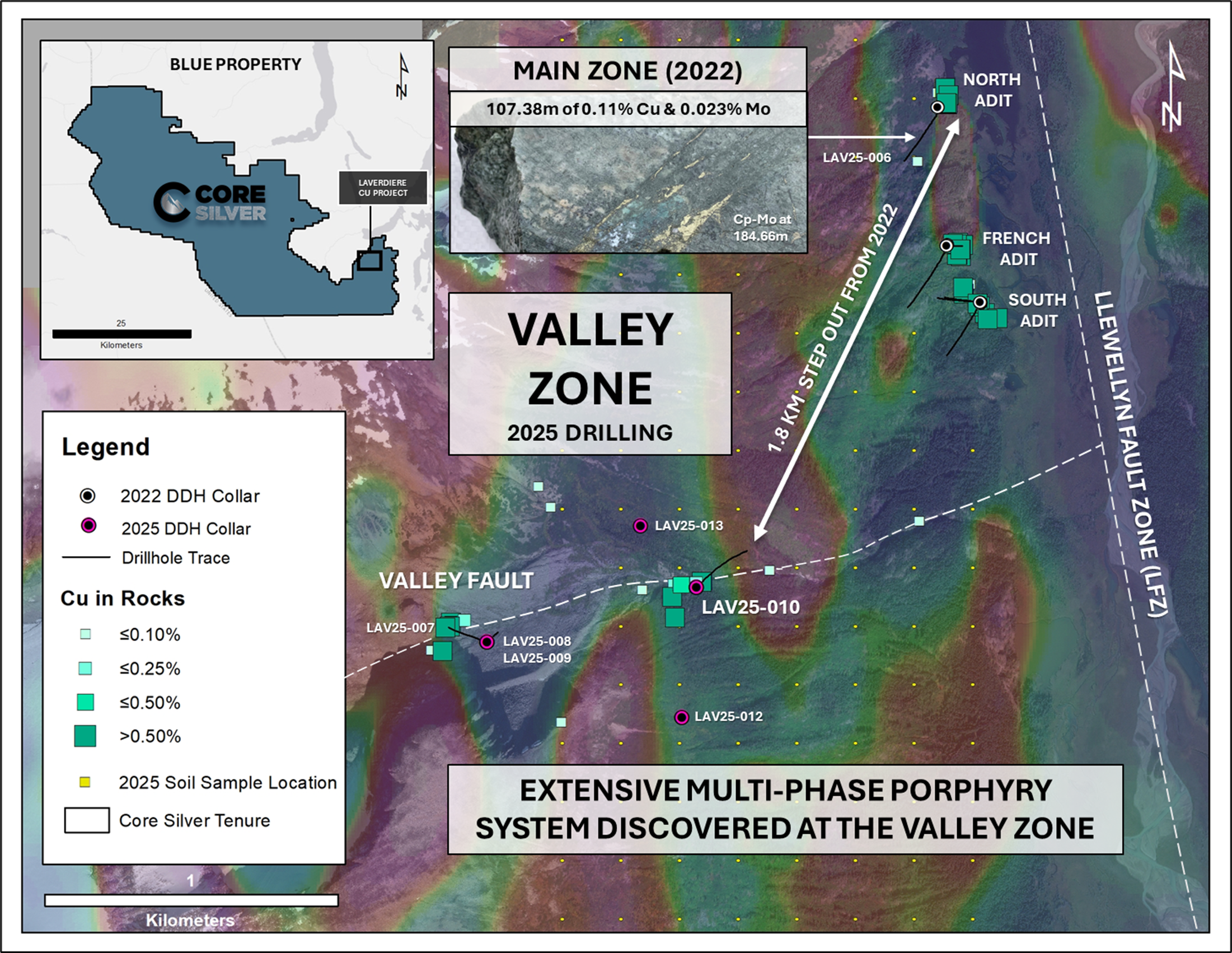 Adits driven into the Laverdiere area in the early 1900s reportedly returned up to 27m grading 1.20% Cu. The Llewellyn Fault Zone, a regional and strongly metal-endowed fault, cuts through the Laverdiere Copper Project for 14km of strike length and marks the contact between the Yukon-Tanana and Stikine Terranes in the Project area. Historic and shallow diamond drilling completed 125m north of the French Adit in 1974 reportedly returned 175m of 0.27% Cu, including 6m of 1.60% Cu and 7.8m of 1.60% Cu. Core Silver’s inaugural diamond drilling campaign at the Laverdiere Copper Project in 2022 returned up to 48.5m of 0.90% Cu, 6g/t Ag, and 0.11g/t Au from 31.46m depth in drill hole LAV22-001 (French Adit), 223m of 0.11% Cu, 2g/t Ag, and 0.006% Mo from 15m depth in LAV22-002 (French Adit), and 107.38m of 0.11% Cu, 0.023% Mo, 0.9g/t Ag, and 0.02g/t Au from 144.62m depth in hole LAV22-006 (North Adit).