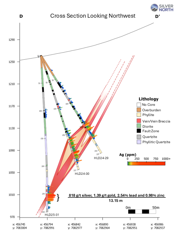 “We are extremely pleased with the results of the 2025 program so far, highlighted by the 90 m downdip step out from last year’s discovery holes at the Main Fault,” stated Jason Weber, P.Geo., President and CEO of Silver North. “The width and grades of the mineralized portion of the structure at the Main Fault continue to impress: HLD25-31 is the best hole drilled on the property to date. We saw some indication of higher gold grades with some portions of the mineralized structure in 2024. With this downdip hole, we are seeing consistent high-grade silver with significantly higher gold concentrations than seen at other targets on the property.”