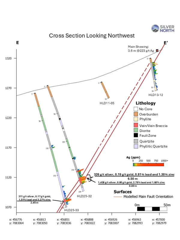 HLD25-33 intersected the Main Fault approximately 45 m downdip of HLD25-33, yielding 2.45 m of 311 g/t silver, 0.17 g/t gold, 1.51% lead and 3.27% zinc within a 5.56 m interval of 176 g/t silver, 0.11 g/t gold, 1.33% lead and 1.96% zinc from 193.49 m down hole.