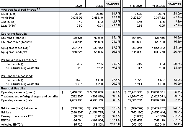 2Average Realized Price, production cost per tonne processed, AgEq sold, cash cost per AgEq ounce produced and AISC per AgEq ounce produced are non-IFRS ratios with no standardized meaning under IFRS and therefore may not be comparable to similar measures presented by other issuers. For further information, including detailed reconciliations to the most directly comparable IFRS measures, see “Non-IFRS Measures” in this news release and the MD&A.