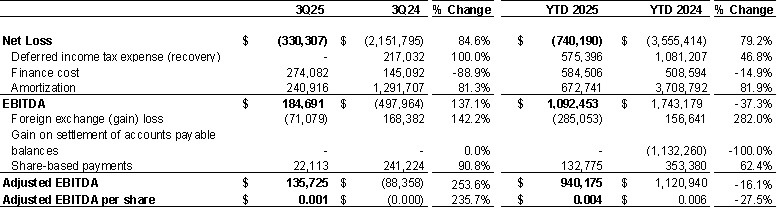 Year-to-date loss before tax decreased by 93% to $165K from $2.5M in the prior-year period. For 3Q25, loss before tax was $330K, a decrease of 83% compared to 3Q24.