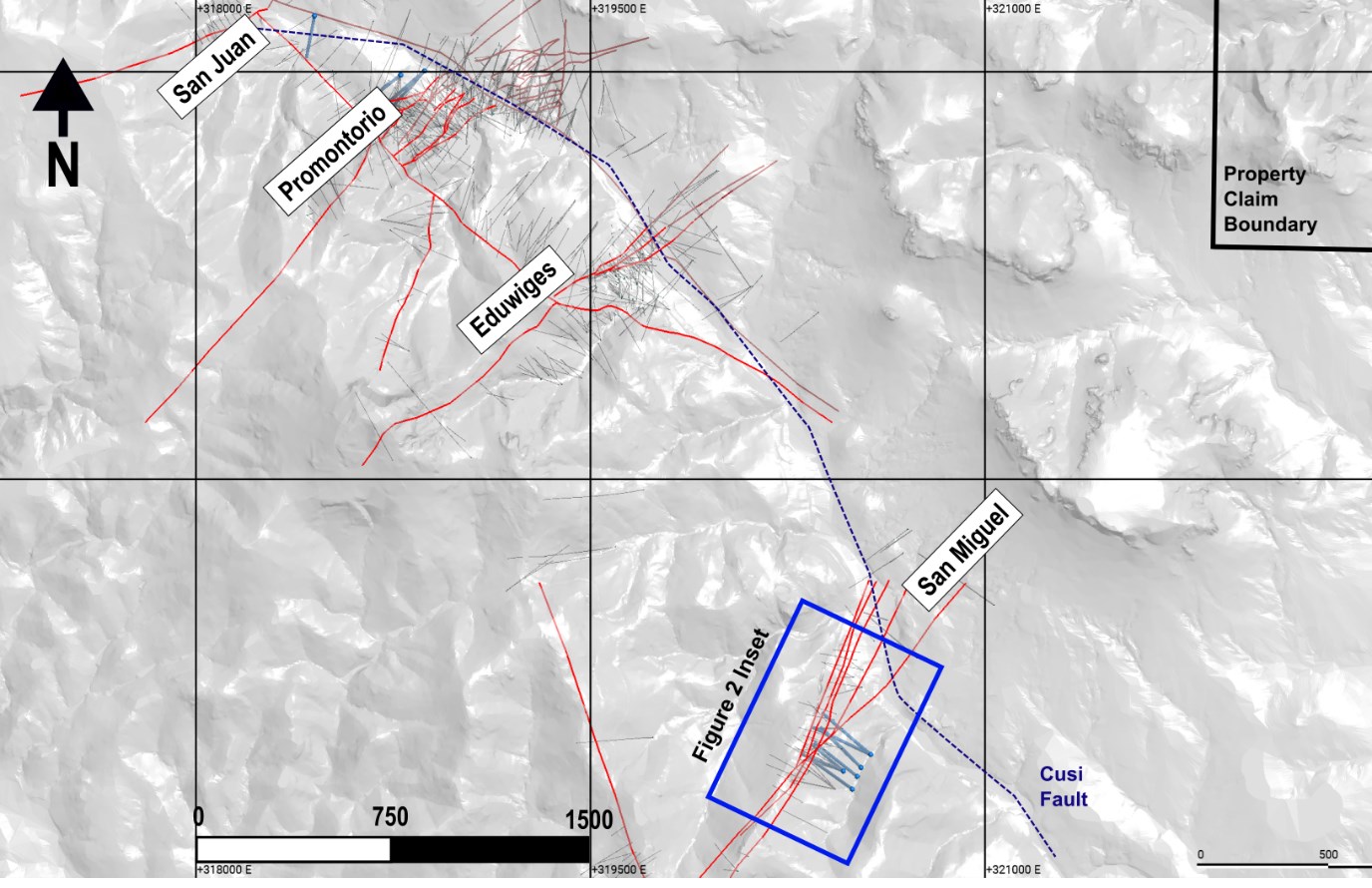 With the acquisition of the Cusi Property, the Company additionally acquired and consolidated two inset claims along the San Miguel vein system. These claims had been in dispute since 2007 and no exploration work had been performed since 2007. This area has a small open pit mine at surface (~30m depth) and minor underground workings from historical mining, assumed to be pre-2000s.