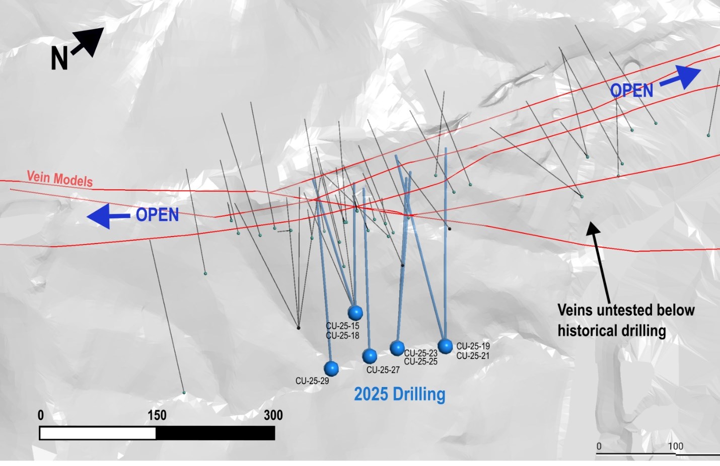 - Reported intervals are downhole core lengths. True widths are estimated at ~70-80% based on vein orientation observed in drill core; however, actual true widths may vary with additional drilling.