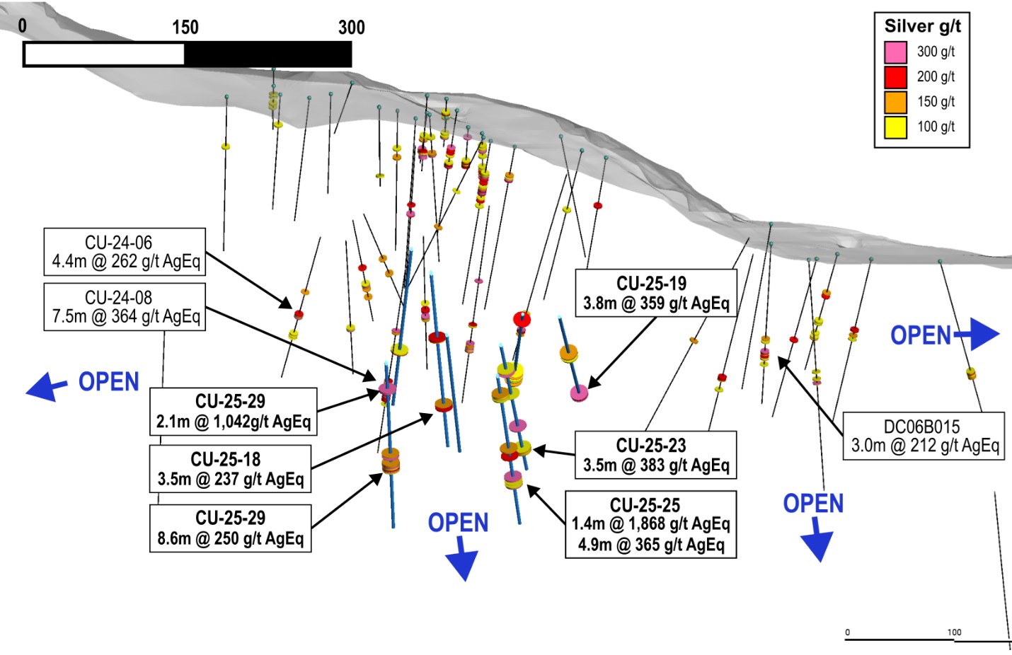 - 250 g/t AgEq over 8.6 metres