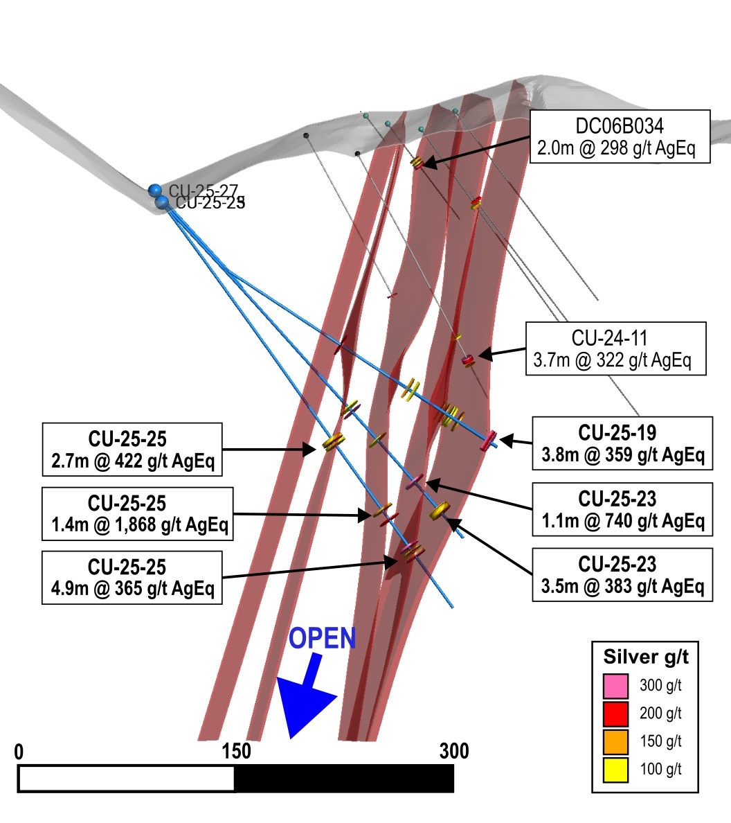 Drilling at San Miguel was completed in approximately 50 metre step outs from 2024 and historical drilling. Initial results have been very successful, with nearly all holes drilled intersecting significant mineralization. Hole CU-25-29 intersected 8.6 metres of 250 g/t AgEq over the main San Miguel vein in an approximate 60 metre step out below last year’s key intercept in CU-24-08 of 7.5 metres at 364 g/t AgEq. Hole Cu-25-25 which was drilled 115 metres east of CU-25-29, intersected 4.9 metres at 365 g/t AgEq at approximately the same elevation as the intercept in CU-25-29. Both holes also had significant high-grade hits in an offshoot from the main vein, with 2.1 meters of 1,042 g/t AgEq in CU-25-29 and 1.4 meters of 1,868 g/t AgEq in CU-25-25.