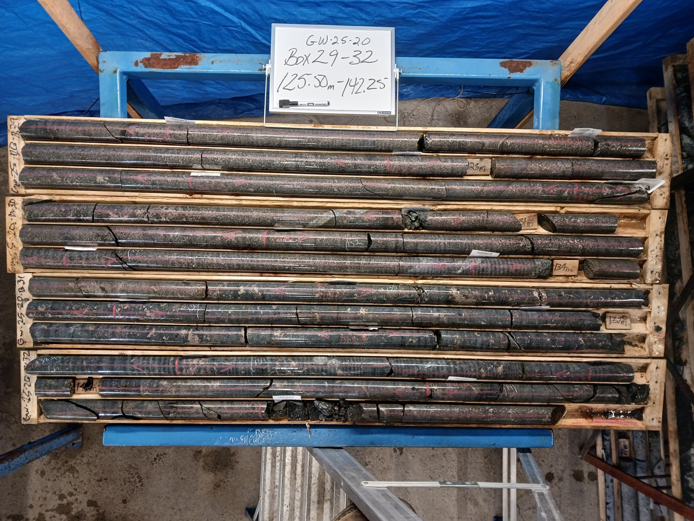 Hole GF25-20 intersected an 74.9 meter zone of mineralized gabbro from 85.7 to 160.6 meters. Hole GF25-20 was set up 30 meters behind hole GW24-06 and drilled at an angle of 65 degrees to test the depth extent of the Farquharson zone.