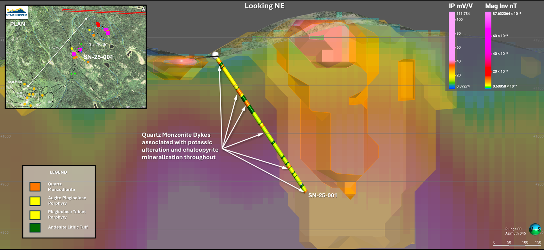 As the inaugural subsurface test of Star North, SN‑25‑001 provides the first drill‑hole look beneath compelling coincident geochemical and geophysical anomalies and will be integral to refining the 3‑D mineralization model for follow‑up drilling in 2026. In combination with the Phase 1 and Phase 2 results from Star Main, and ongoing work at the Copper Creek satellite target, the textures, alteration and chalcopyrite occurrences observed in SN‑25‑001 are encouraging indicators that Star North may represent a second mineralized center within a broader porphyry cluster framework on the Star Project.