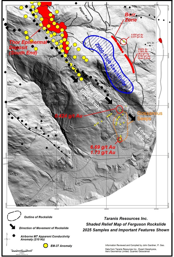 Geochemical sampling of the Ferguson Rockslide was undertaken from a number of gossanous seeps along the main Thor access road, and from a number of streams that exploit longitudinal cracks extending the length of the rockslide. Sampling of colluvium was also undertaken upslope of drill hole Thor-255. This sampling revealed two areas of highly anomalous gold content accompanied by high levels of geochemical silver in the Ferguson Rockslide and an area of elevated gold in soils 0.5 km northwest of the Borr Zone discovered in Thor-255 (See Taranis News Release dated 10/27/2025).