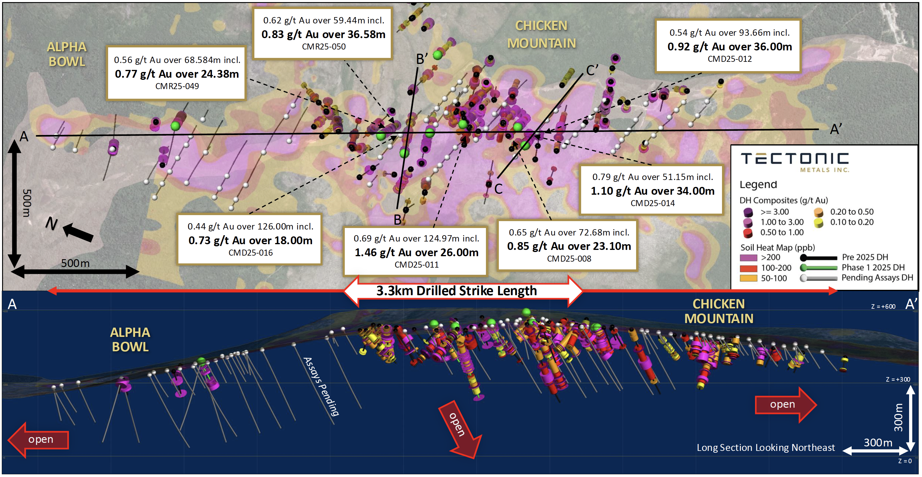 Figure 1: Plan View and Long Section looking Northeast, au composites with pending assays can be viewed at: https://www.tectonicmetals.com/_resources/news/nr-20251126-Figure1.png