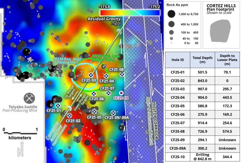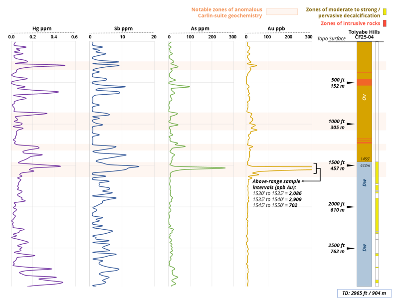 Kelly Cluer, Director, noted “As I was scrolling down the CF25-04 assay report, what really caught my attention was a 39-metre zone in the Wenban Formation containing elevated gold, arsenic, antimony and mercury, which also included 3 metres of 2+ g/t gold. This is precisely what we’ve been hoping to see at this early stage: geochemical evidence of a system that can produce both tonnage and grade, and we were rewarded in that regard in only the fourth hole back from the lab. This is a brand-new gold zone at Toiyabe Hills, essentially stumbled into with a wide-spaced drilling array. I’m more excited than ever to see what comes from the entire 2025 Campfire framework drilling campaign, and what targets will emerge as we digest all the downhole data over the winter.”