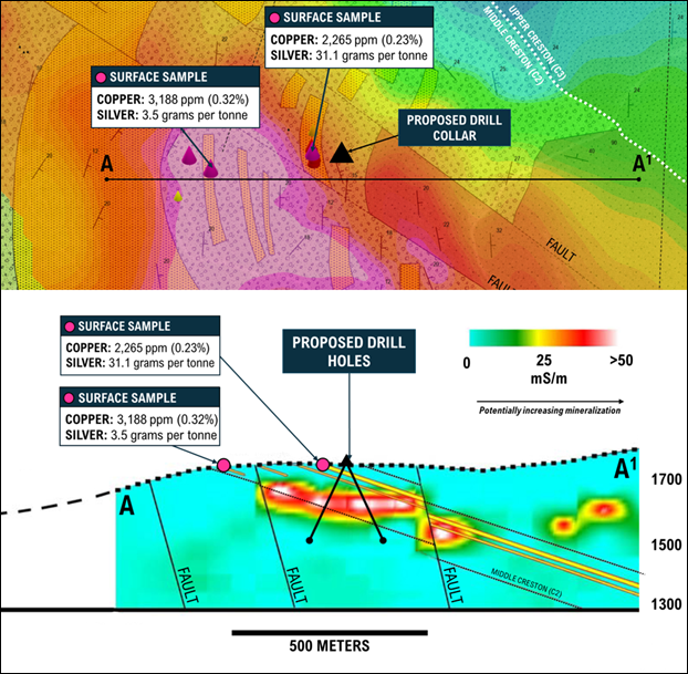A historical 2017 drill hole (SFJR-17-013) completed by Kootenay Silver Inc., located approximately 500 metres southeast of Aeonian’s proposed drill holes at the Jake Target, intersected 130 metres of mineralized Middle Creston rocks, including visible native copper, chalcopyrite, and minor bornite. Assays returned copper values up to 698.4 ppm Cu, confirming the presence of a broad zone of copper mineralization in the down-dip extensions of the Jake Anticline.(3)