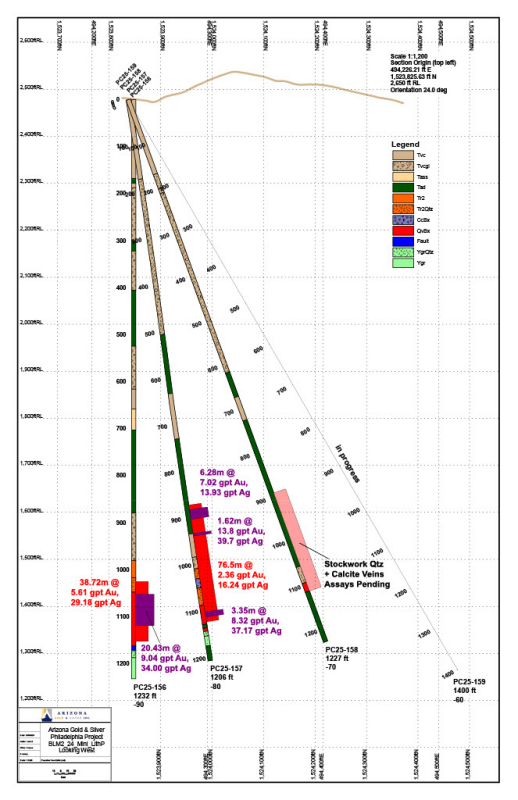 Vancouver, British Columbia – TheNewswire – December 08, 2025 – Arizona Gold & Silver Inc. (TSXV: AZS) (OTCQB:AZASF) is pleased to announce it has received assays from the latest core hole, PC25-157. In this drill hole the mineralized structure is wider due to the presence of gold in additional host rocks. Drilling is continuing with PC25-158 in progress.