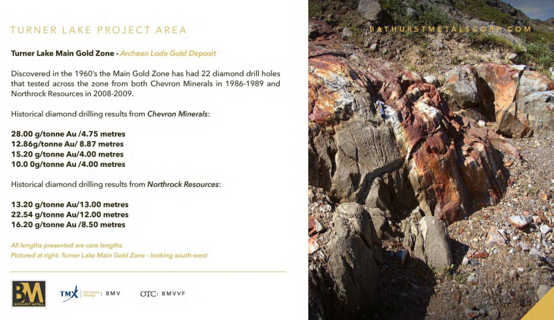 Figure 1 (below) highlights historical gold results from Turner Lake that underscore the broader potential of the district and support Bathurst’s strategy of consolidating and exploring the surrounding gold-bearing terrain. Northrock Resources assay results from October 20, 2009 Northrock Resources news release.
