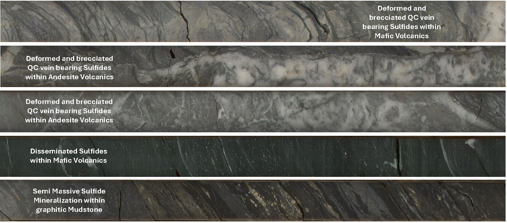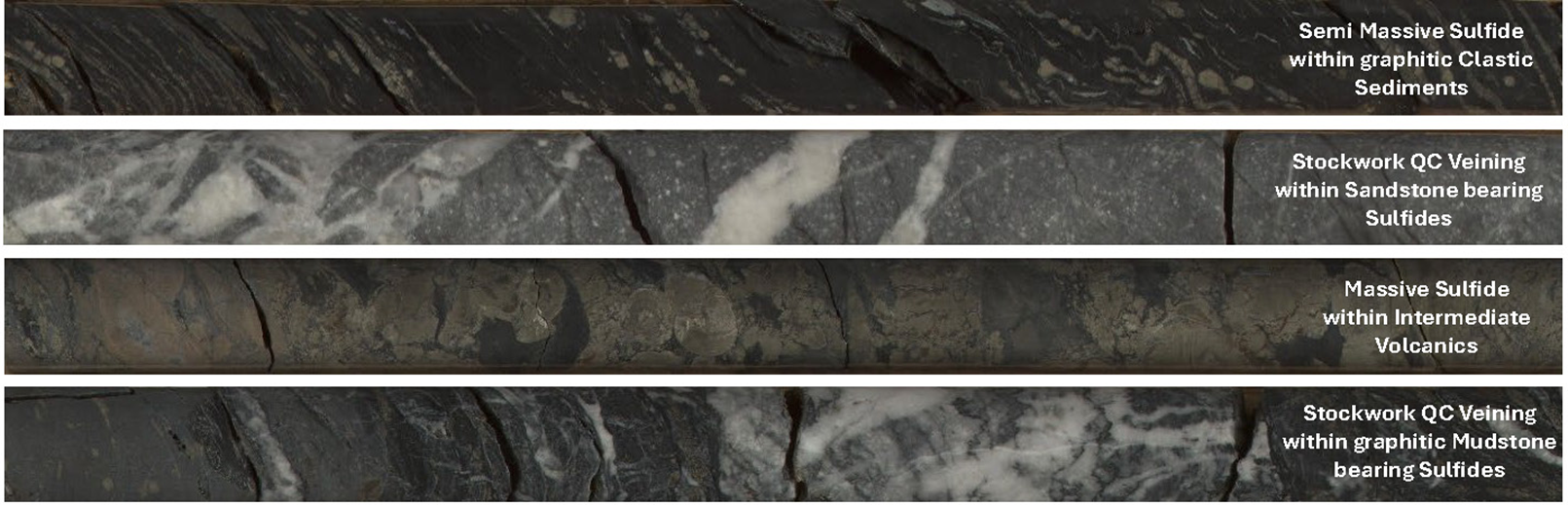 The mineralized sections of N2-25-008 was within the sheared and deformed intermediate to mafic volcanic and fine to medium grained less graphitic clastic sediments (mudstone and wake) rock formations associated with quartz and quartz carbonate veins and veinlets and the main alteration products of chloritization, sericitization, carbonatization and silicification dominantly including pyrite, arsenopyrite and less pyrrhotite mineralization in different forms of disseminated, cluster, stringer and semi massive sulfide which is dominantly are associated with veining formation process (Fig. 3).