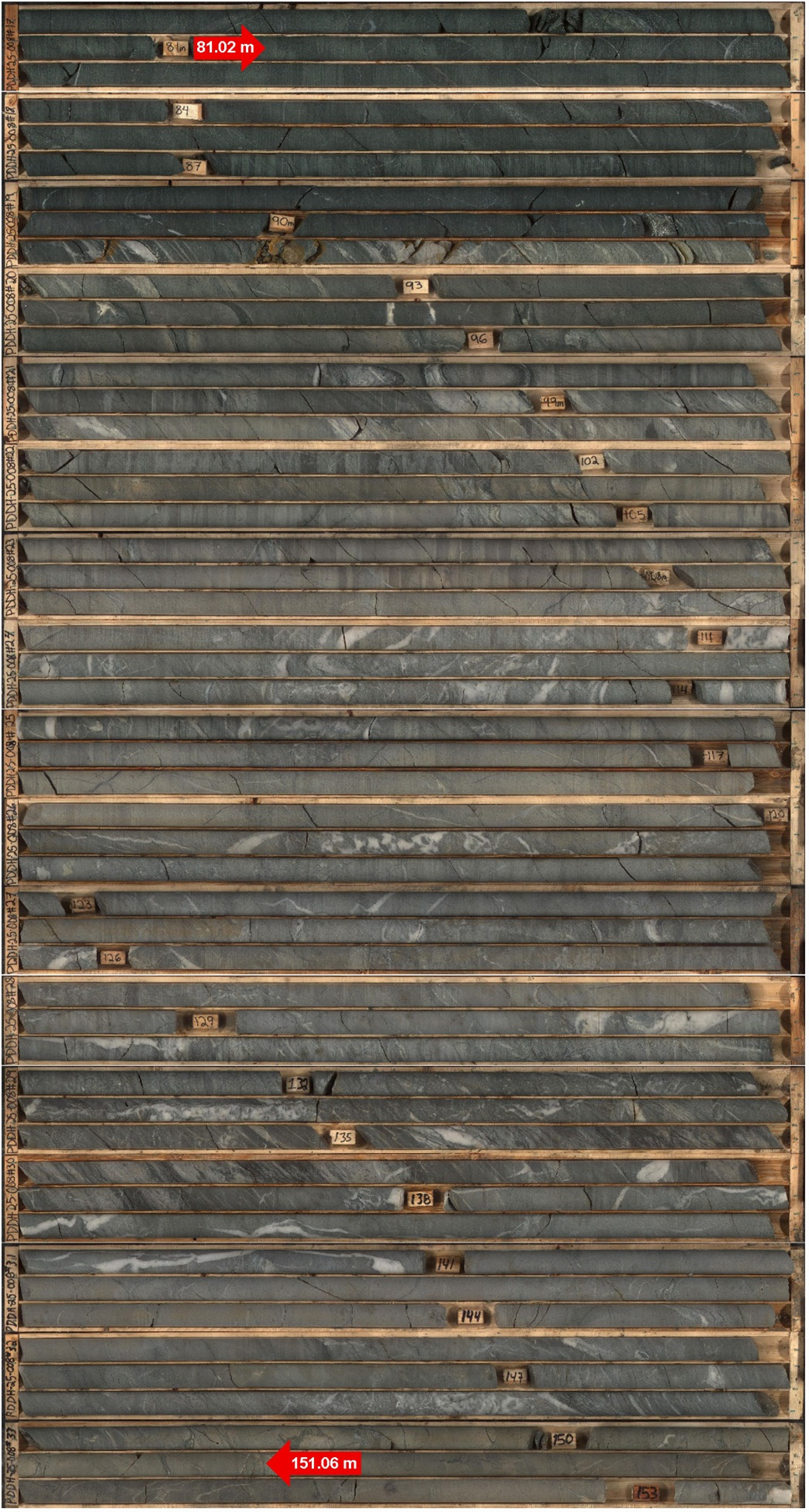 The intense quartz-carbonate veining, silicification, and sulfide mineralization (pyrite/arsenopyrite) observed visually in the core of N2-25-003 and N2-25-008 are directly comparable to the material that yielded long gold intervals in historical drilling within these zones including 245-91-151, which intercepted 1.7 g/t Au over 35.0 metres.