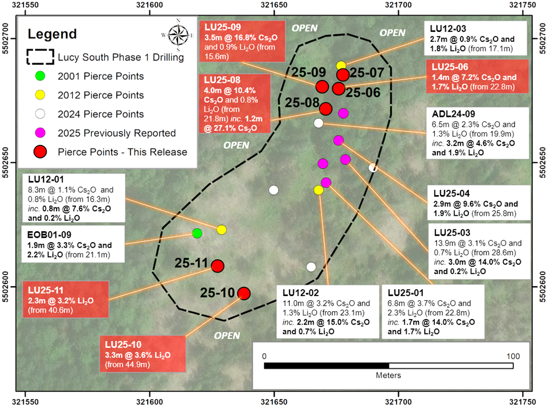 Highlights from the second batch of assays (holes 6-11) include 4.04 metres with 10.4% Cs2O and 0.76% Li2O (LU25-08; from 21.8 metres) and 3.45 metres at 16.8% Cs2O and 0.86% Li2O (LU25-09; from 15.6 metres).The highest-grade intercept to date in the program was a sub-interval of 1.24m grading 27.1% Cs2O in drill hole LU25-08.
