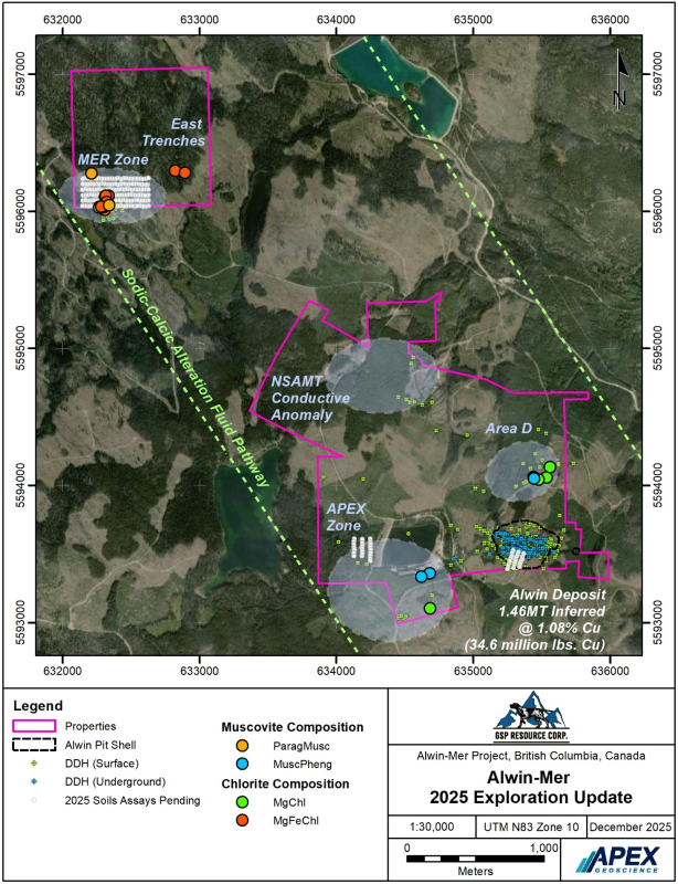 Vancouver, British Columbia – TheNewswire – December 16, 2025: GSP Resource Corp. (TSX-V: GSPR / FSE: 0YD / OTC: GSRCF) (the “Company” or “GSP”) announces the receipt of surface rock sample visible and short wave infra-red (VIS-SWIR) hyperspectral TerraSpec® analysis from its recently completed Fall 2025 Alwin Mine and Mer property geologic reconnaissance. The Company also announces that geochemical analytical results for an additional 204 targeted grid soil samples are pending.