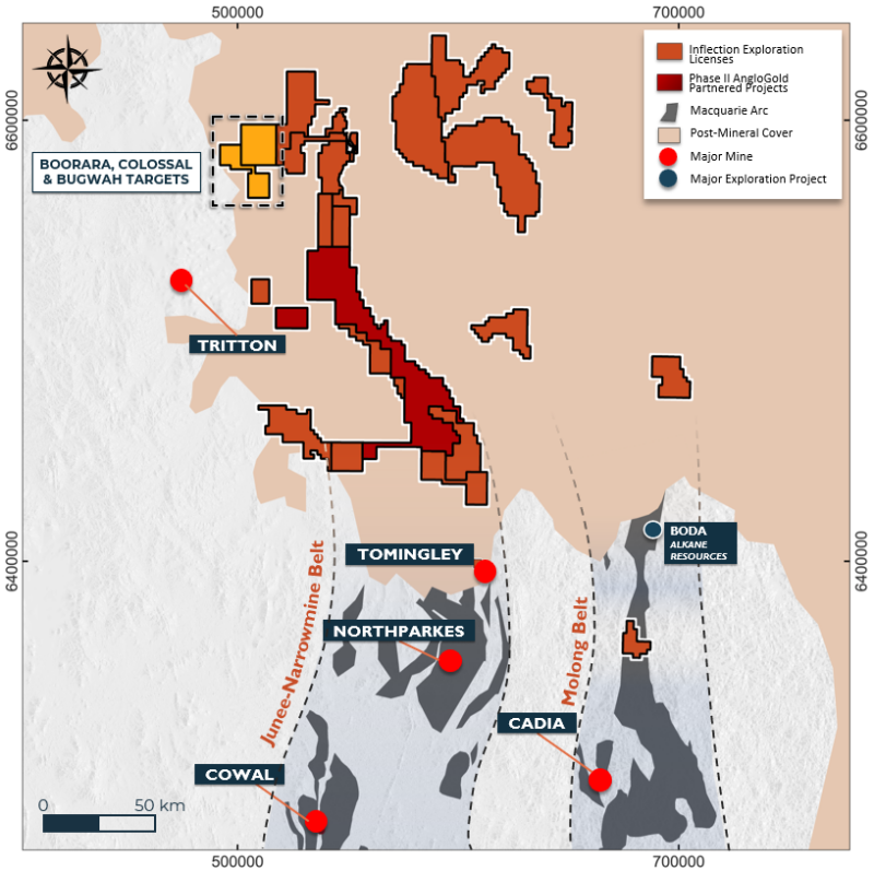 The Company has commenced land access discussions and permitting for drill programs on these licenses. The drill programs will involve completion of approximately twenty drill holes which is a cost-effective and efficient drill technique to collect lithological, mineralisation and geochemical data from the top of the basement which will provide valuable vectors for potential deeper drilling. Inflection will draw on our in-depth technical expertise of other gold-copper deposits in New South Wales to analyse the data collected in this program.