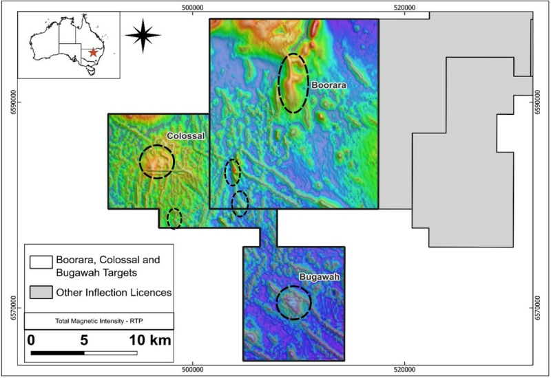 The six targets are 100% owned and part of the broader Colossal, Bugwah and Boorara target areas. Each target exhibits discrete zones of complexity in regional aeromagnetic data and embayment’s in the gravity data consistent with shallow intrusions with potential associated alteration.