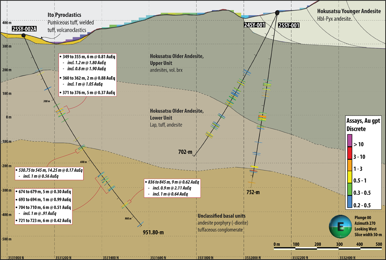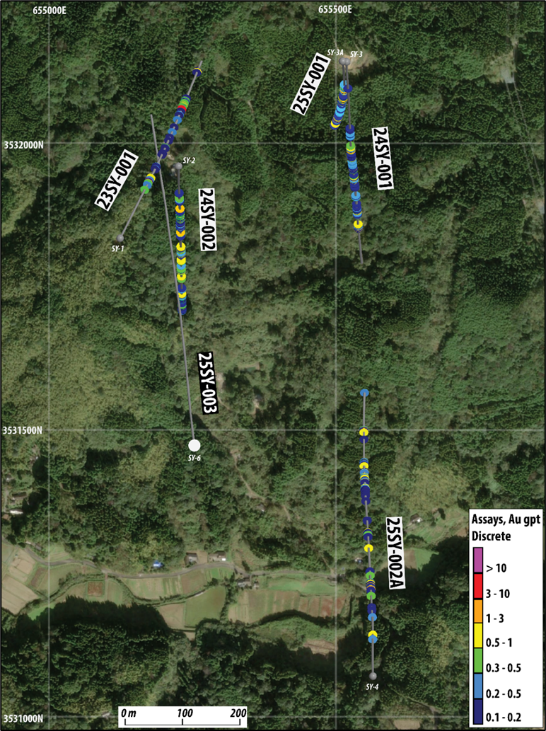 Irving recently completed its fifth diamond drill hole at Yamagano East, 25SY-002A, drilled to a depth of 951.8 m at an azimuth of 357° and inclination of 66° (Figure 1). The collar of 25SY-002A is located approximately 1.07 km south of earlier drill hole, 25SY-001.