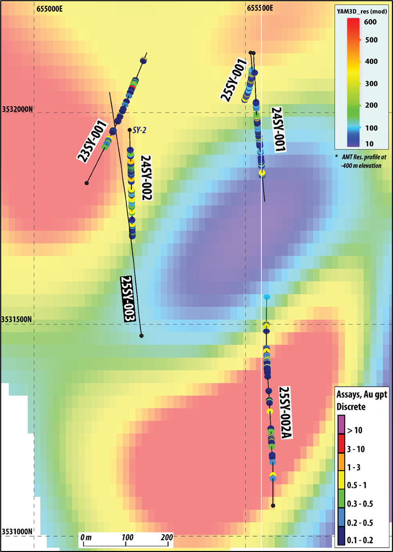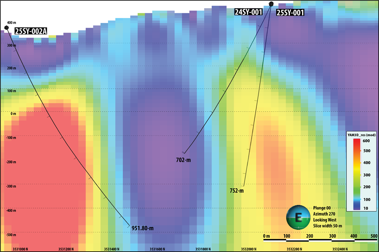 Two distinct high-resistivity bodies, located in the northern and southern parts of the project area, are evident in AMT data and have been the target of recent drilling (Figures 2 and 3). Drill hole 25SY-002A was designed to test the southern deep resistive feature which is spatially coincident with a northeast-southwest-trending zone of demagnetization. Previous drilling, targeting the northern resistive feature, returned geological indicators of mineralization. Drill hole 25SY-002A represents the first attempt to test the southern resistive target and is the deepest drill hole ever completed at Yamagano.
