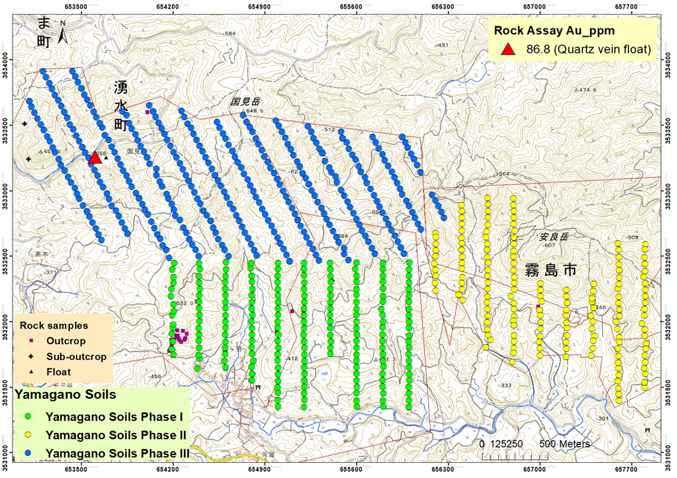Phase I soil assay results have already yielded multiple samples returning values greater than 1,000 ppb Au (>1 g/t Au), with the highest value of 7,940 ppb Au (7.94 g/t Au) and 5.2 g/t Ag, located approximately 500 m southwest of the historical Yamagano mine workings. Elevated concentrations of Au, Ag, and As were detected proximal to historical mining areas with several anomalous trends extending eastward. In addition, anomalous Hg and Sb values exhibit similar spatial patterns while also extending in a southward and southwestward direction from the historical mine workings.