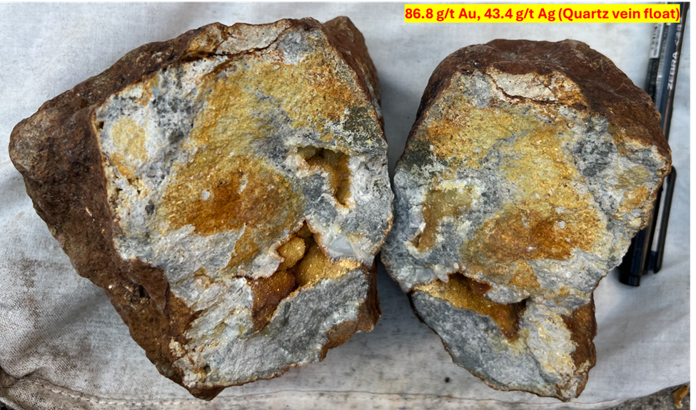 With the completion of the Phase III soil program in mid-December 2025, a combined total of 673 soil samples and 57 surface rock samples (excluding QAQC samples) were collected. Assay results from surface rock float samples collected during the Phase I and Phase II soil programs returned a peak value of 86.8 g/t Au and 43.4 g/t Ag from a quartz vein sample (Figure 6).