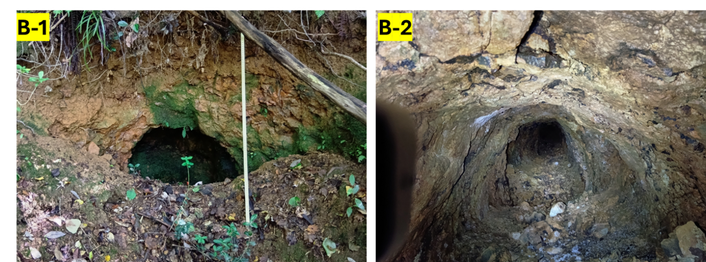 Figure 5 Sample locality of Fig.4, a northeast-southwest trending historical tunnel at the Unoya mine area (B-1, the scale in 1m) and its crawl-in image (B-2).
