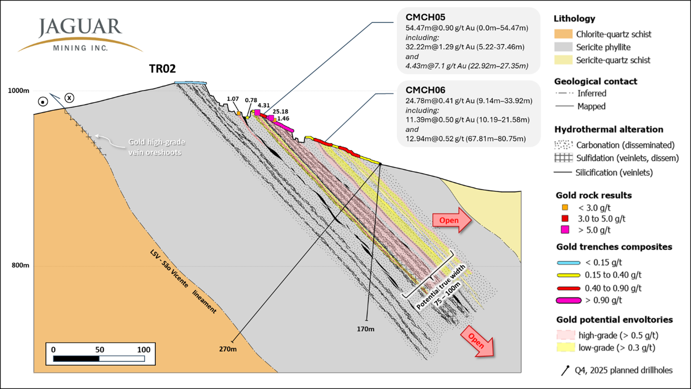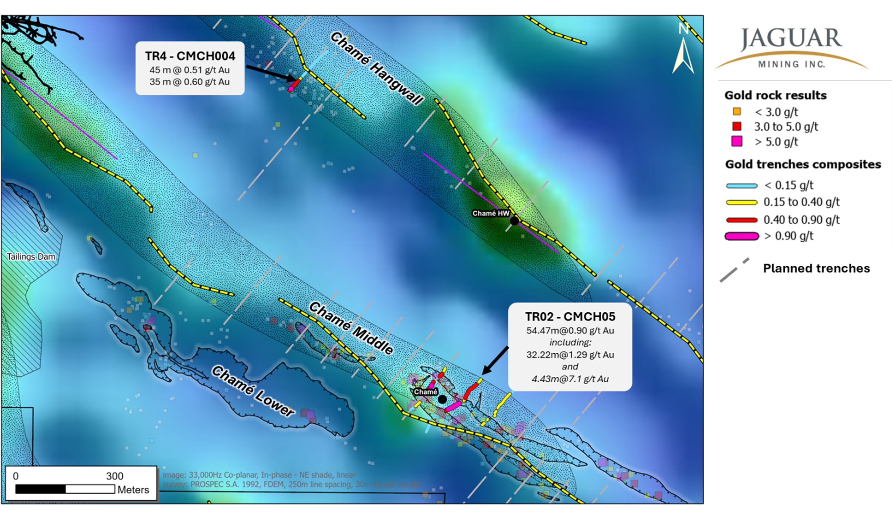 The Chamé drill program follows up on initial encouraging results (see Jaguar Mining press release dated September 9, 2025) and builds on strong trenching results from Trench TR02, which returned: