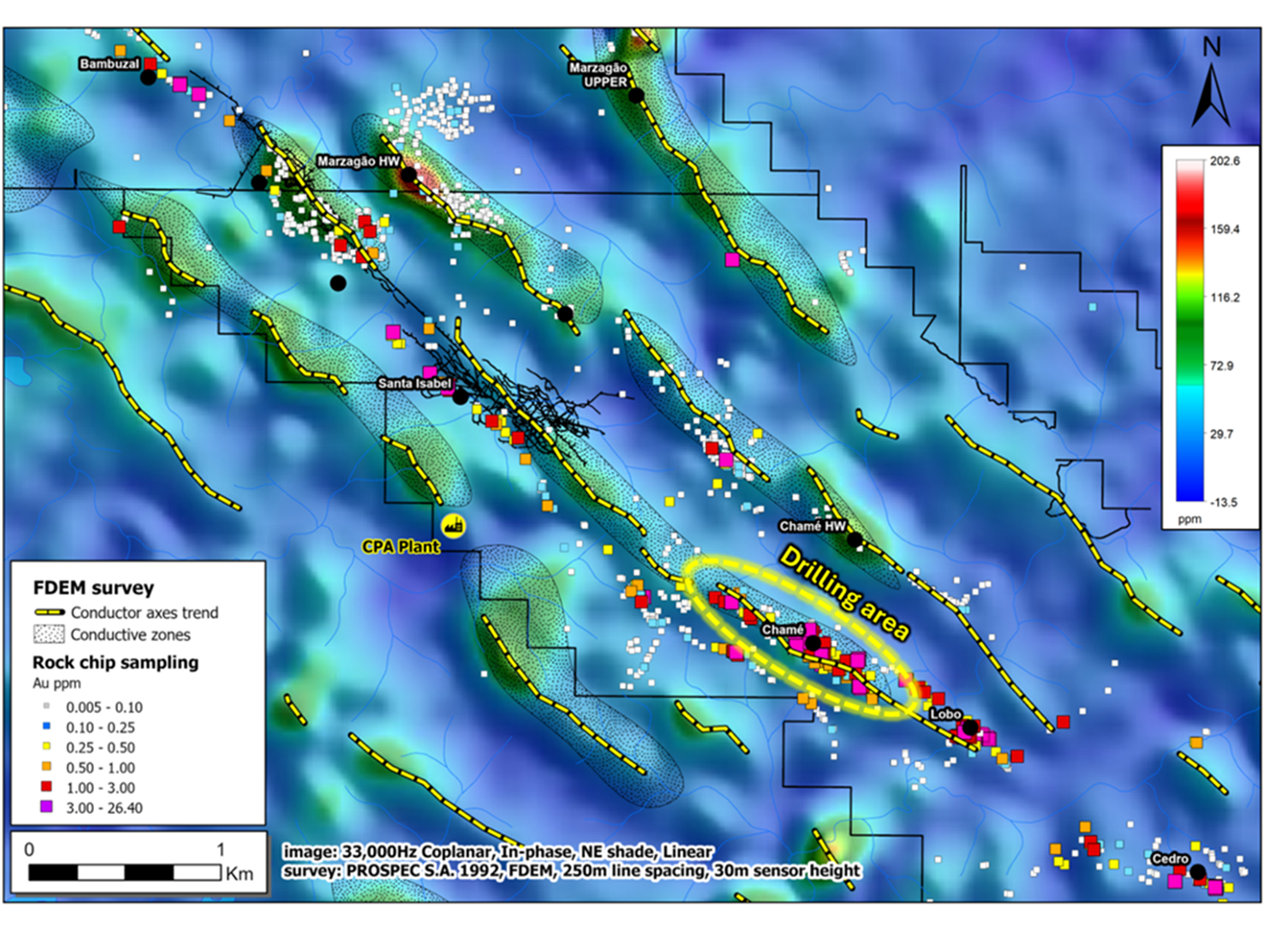 The Chamé target is located within the São Vicente lineament, which is an important mineralized crustal shear zone, characterized by a curvilinear geometry that stretches for approximately 60 kilometres across the Iron Quadrangle, following a northwest-southeast structural orientation. This lineament contains several orogenic gold deposits and exploration prospects, including Santa Isabel mine, Marzagão mine, Bahú, Engenho d’Água, Bicalho, Bela Fama, and Morro Velho, among others.