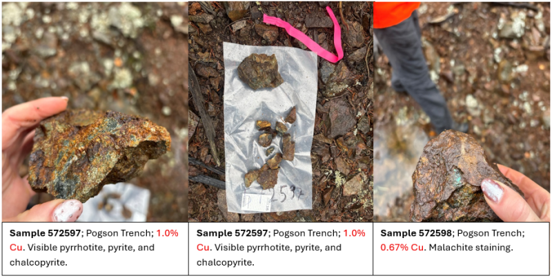 The mineral occurrences sampled, and RUSH multi-element assay results are shown in Figure 1 and listed in Table 1. Photographs of selected samples are shown in Figure 2. The due diligence program successfully confirmed the presence of copper mineralization on the property. Particularly at the Pogson Trench prospect and defined elevated copper contents in newly sampled areas along the Pogson Trench trend on the Lavender Property.