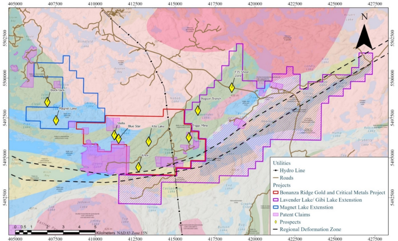 Figure 3. Ontario Geological Survey regional geology map with key property acquisitions that comprise the Bonanza Ridge Gold and Critical Metals Project. Lavender Lake and Gibi Properties (hashed purple area) shown as one Property. Known mineralized prospects shown in yellow diamonds. Regional deformation zone outlined by dashed lines.