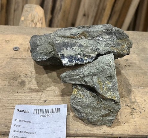 Samples 280461 through 280464 below (Figure 1) are examples of the massive Hi-Grade Copper sulphide mineralization (Chalcopyrite). Covellite is also clearly seen in sample #280461 and #280463, as a dark blue cast in colour. The samples were collected in the area highlighted in Figure 2, immediately to the west of the footings for the old hoist and the remains of the shaft. These are well-known landmarks.