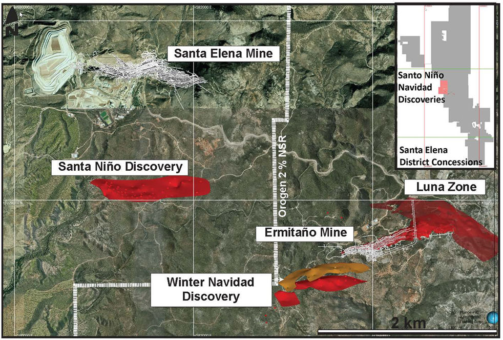 Orogen holds a royalty interest on the approximately 167 square-kilometre Ermitaño mining concession, located in Sonora, Mexico. Ermitaño is contiguous with the Santa Elena mining claims both of which are owned and operated by First Majestic. (Figure 1). Orogen’s area of interest contains the producing Ermitaño deposit, the Luna and Aitana veins, and the recently discovered Navidad/Winter vein systems.