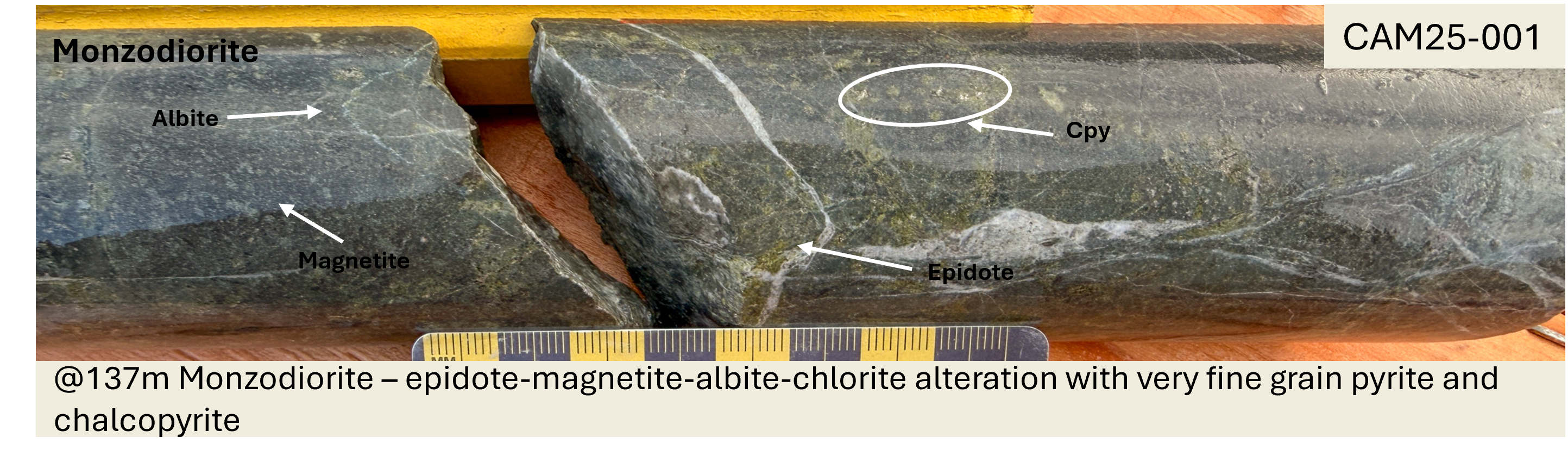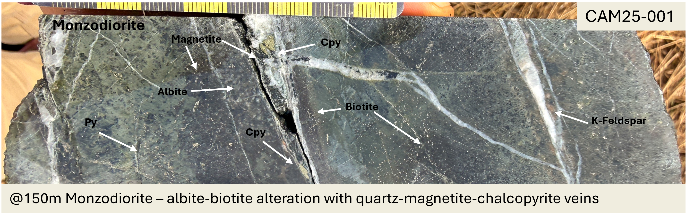 Mineralized intervals are associated with overprinting alteration and vein assemblages, particularly holes CAM25-001, 002, and 006. These intervals exhibit multiple episodes of moderate to strong porphyry-style alteration and veining, which includes strong K-feldspar, albite, and epidote alteration.