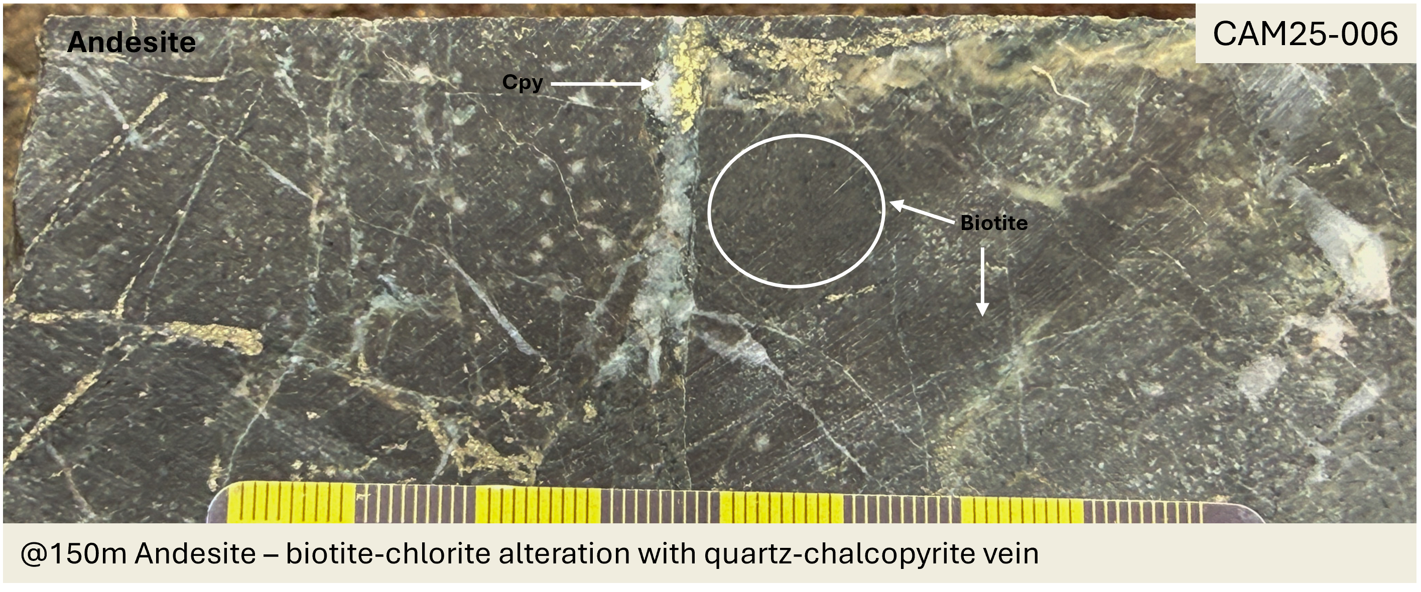 Drill hole CAM25-006 intersected variably K-feldspar altered andesite, diorite, and monzodiorite, hosting minor amounts of fine disseminated pyrite and 1-4% pyrite veinlets, as well as weak to trace very fine grain chalcopyrite from 140 m depth to the end of hole.