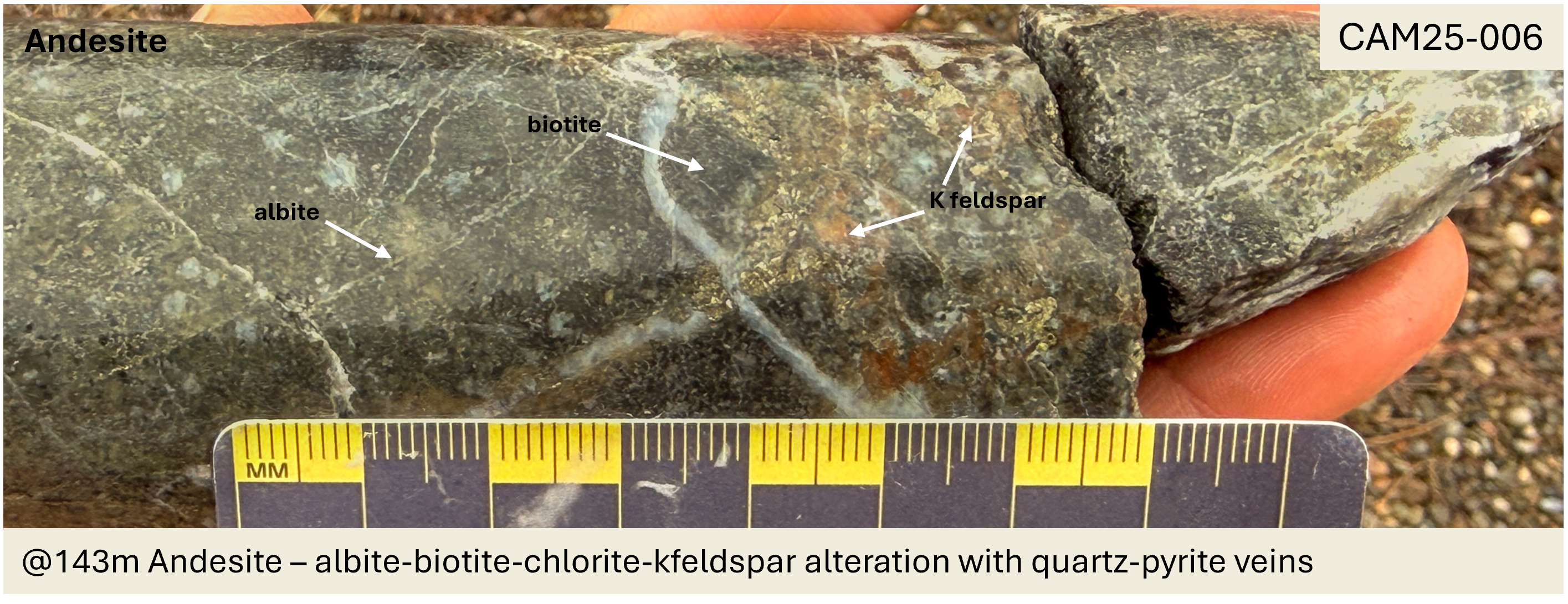Hole CAM25-003 showed weak to moderate porphyry-style alteration, dominantly quartz veins with lesser K-feldspar veins, and pyrite with lesser chalcopyrite mineralization; all generally increasing in intensity with depth.