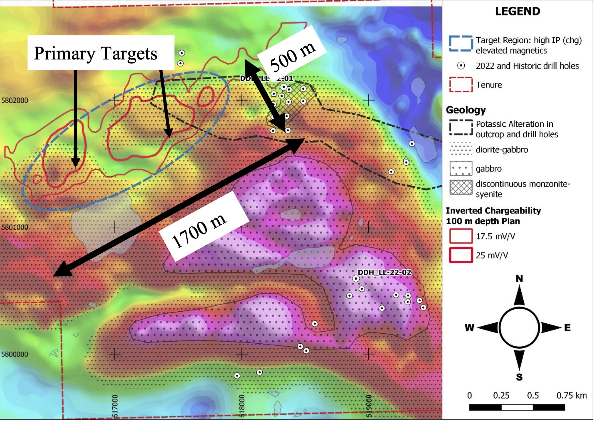The project area benefits from year-round road access and excellent regional infrastructure. Previous exploration workii,iii has outlined a 1700 m x 500 m coincident chargeability-magnetic anomaly trending northeast-southwest beneath shallow till cover in an area that has not been previously drilled (Figure 3).