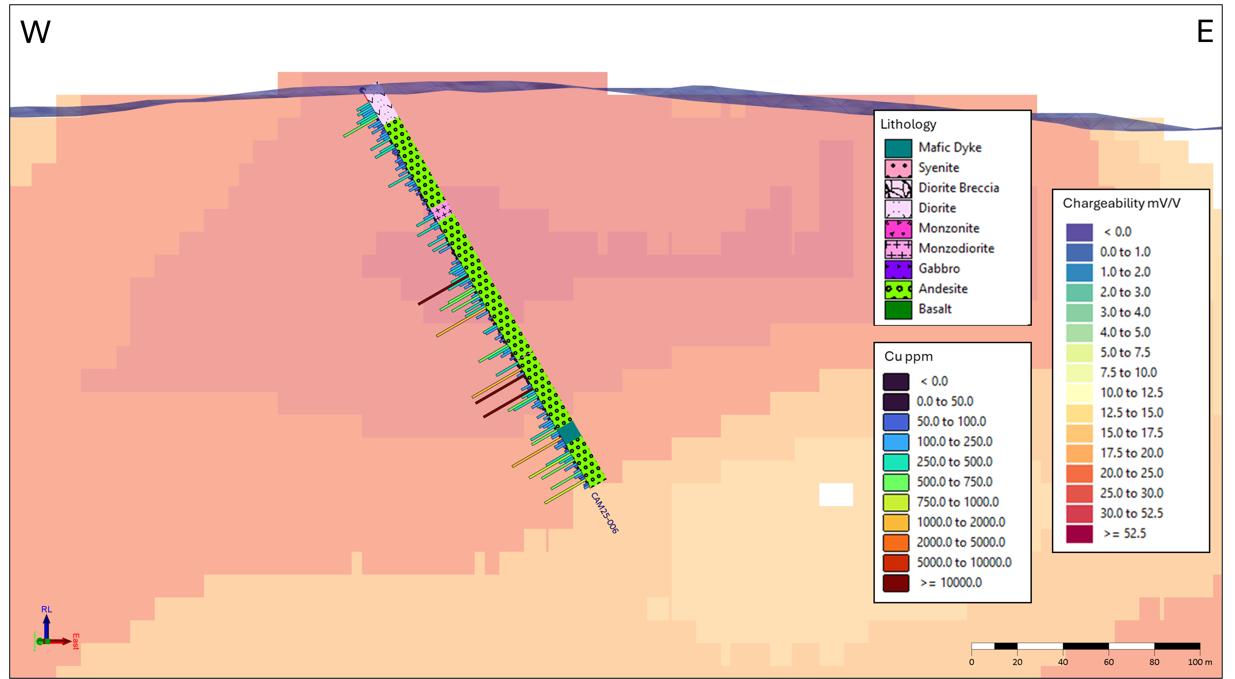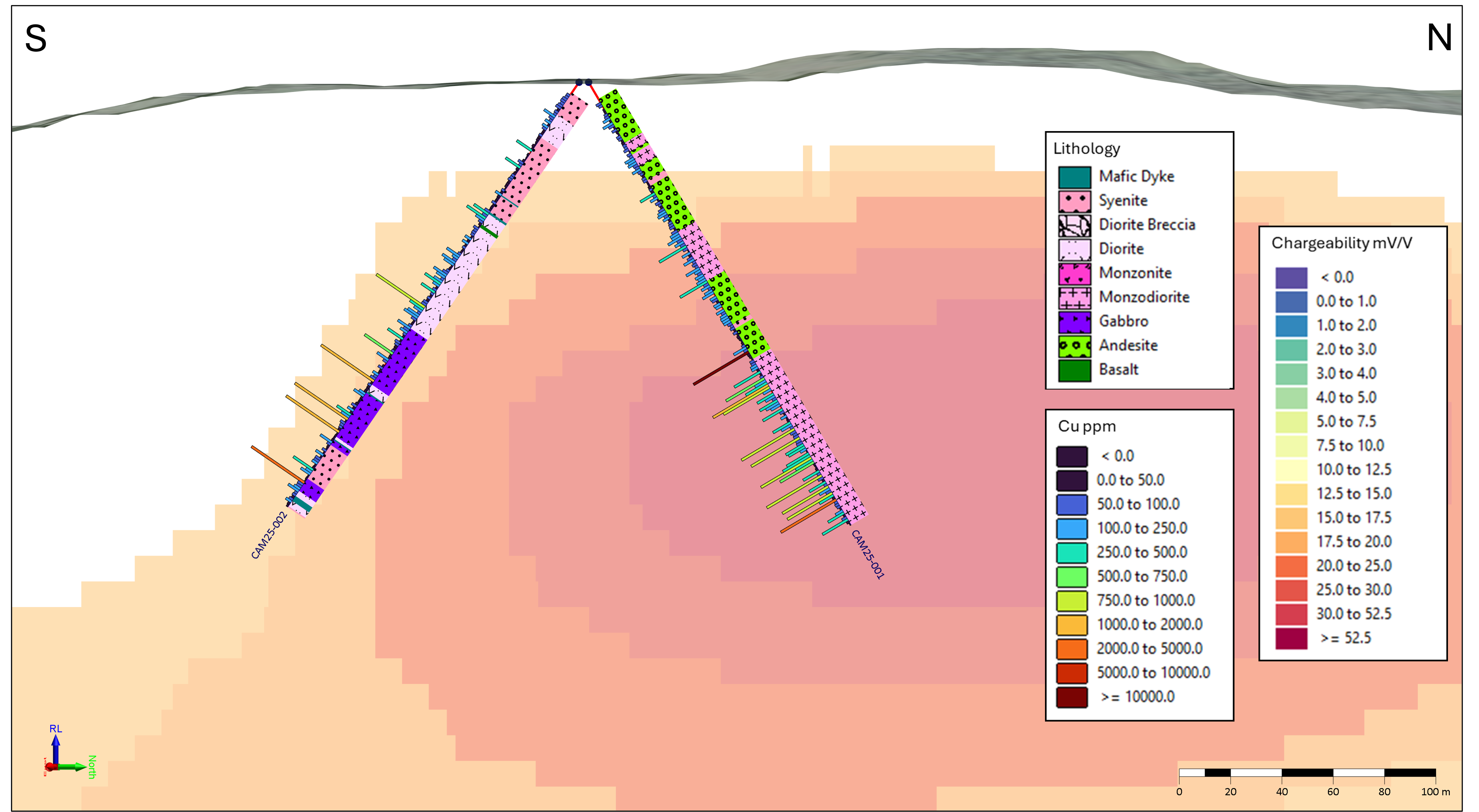 CAM25-005 and CAM25-006 tested a large high chargeability anomaly with isolated inverted magnetic pipe like features at depth (Figure 7). Drill hole CAM25-005 intersected mostly weak to moderately pyrite-mineralized diorite with trace to weak disseminated chalcopyrite, and elevated (2-5%) quartz and quartz-carbonate veinlets.